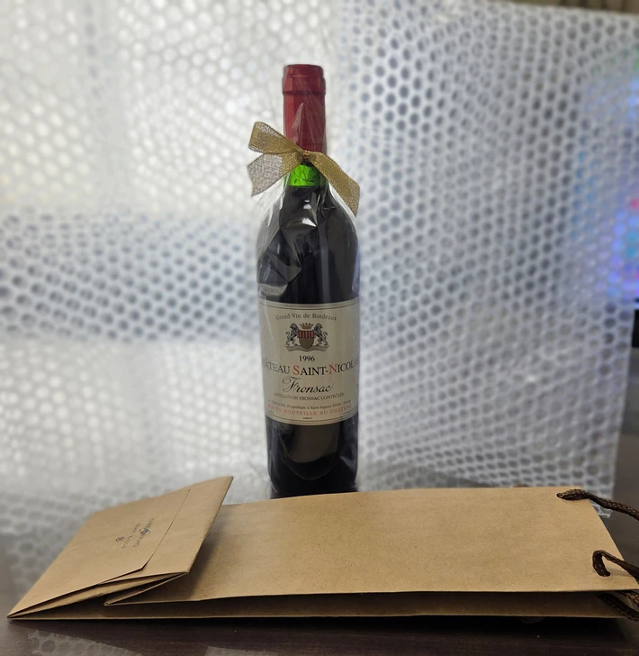生まれ年のワインを木箱で正面がガラスになっている入れ物にラッピングしていただいたので、中身のワインラベル見えて、感謝!の金文字も高級感がありました。