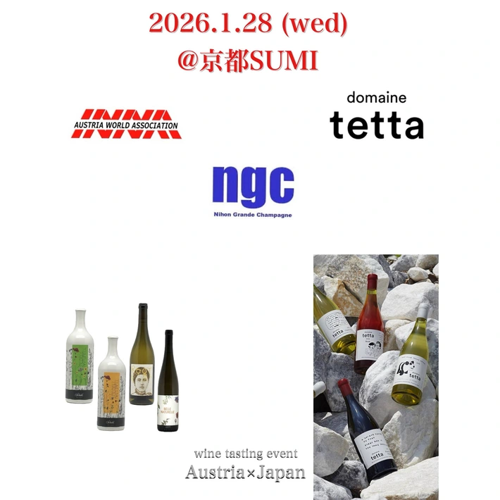 ウィルトス神宮前主催のワインイベントです。 【主催者からのコメント】 2026年初の京都SUMI 試飲会 インポーター2社、 日本ワイン生産者1社 豪華3社での開催です✨ AWA、日本グランドシャンパーニュからはオーストリアワインを中心にセレクト。 ・AWAの佐野さんよりハレタ、ユルチッチ、シャーブルを。 ・日本グランドシャンパーニュの牛嶋さんより新着やオス・・・