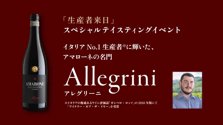 【主催者からのコメント】 イタリアNo.1※生産者に輝いた、アマローネの名門、アレグリーニ 寒い季節にこそ飲みたい、濃厚リッチな極上赤ワイン「アマローネ」でおいしいひと時を 1年で最も寒い2月は、香りが華やかでリッチな味わいの赤ワインが飲みたくなる季節です。 そんな時期におすすめの赤ワインを手掛ける造り手、イタリア北東部ヴェネト州の名門・アレグリーニが来日!・・・