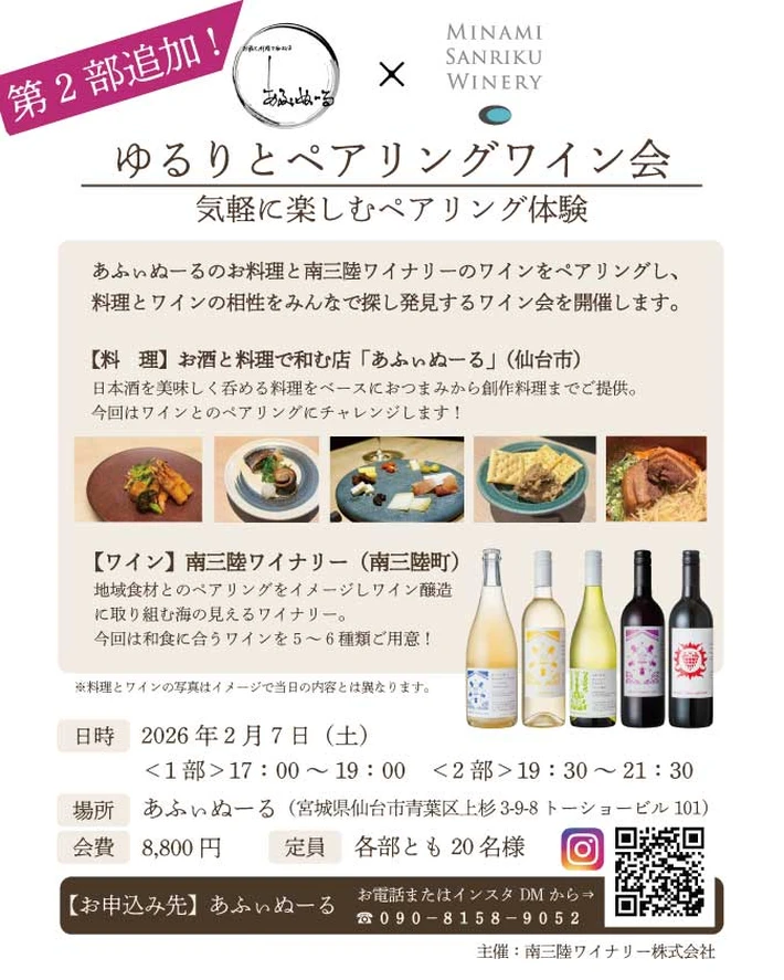 【主催者からのコメント】 2月7日(土)に仙台「あふぃぬーる」にて、あふぃぬーるのお料理と南三陸ワイナリーのワインをペアリングし、料理とワインの相性をみんなで探し発見するワイン会を開催します。 ■ 詳細・申込み 南三陸ワイナリー ゆるりとペアリングワイン会