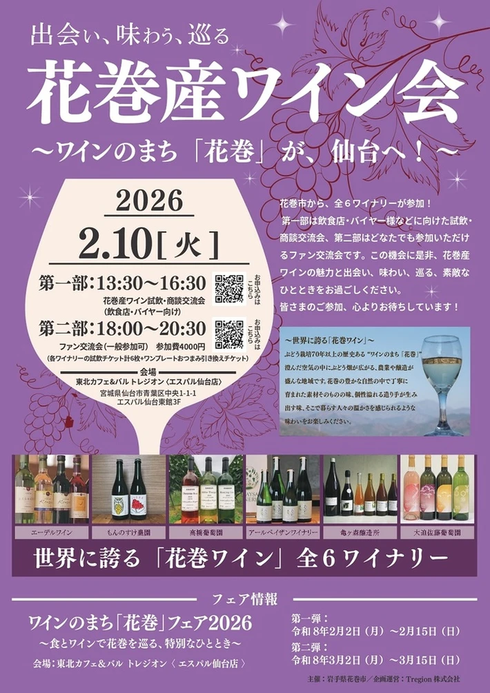 【主催者からのコメント】 仙台市および東京都(港区赤坂)で花巻産ワインをお楽しみいただける交流会を開催します。 花巻の豊かな自然の中で丁寧に育まれた素材そのものの味、個性溢れる造り手が生み出す味、そこで暮らす人々の温かさを感じられるような味わいをお楽しみください。 ■ 詳細・申込み 花巻産ワイン会