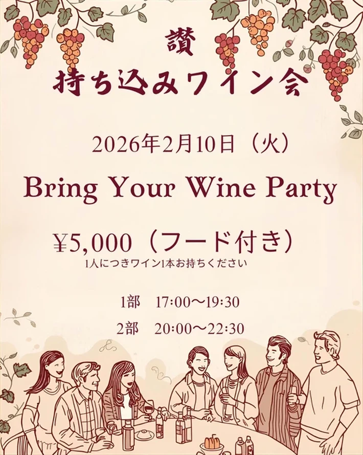 【主催者からのコメント】 2月10日(火)の祝前日に山手 讃初のワイン会🍷を開催します! かしこまったワイン会じゃなくて只々楽しくおいしくいろんなワインを飲もうっていう会です! 参加資格はただひとつ、ワインを1人一本持ってくるだけ!(会費は5000円) 手ぶら参加だと7000円になります。 ワインは産地も種類もお任せします! もちろんお店でも何本か用意します・・・