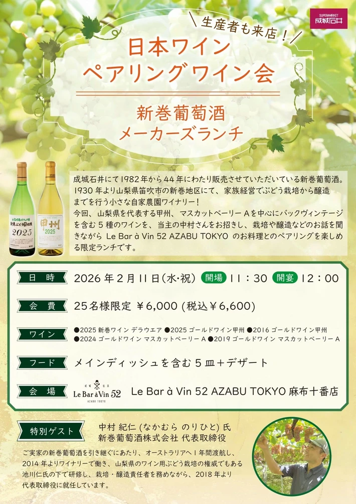 【主催者からのコメント】 🍷インポーター来店イベント!🍷 🎁当日ボトル購入で500円キャッシュバック🎁 今注目すべき国はドイツです! 今まで参入が難しい地域にも、若手生産者が力を発揮するようになり、様々な地域で驚くようなワインが生産され始めています😊 今回はワインの輸入業者である相模屋本店の渡部さんにお越しいただき、お勧めの若手ドイツ3社をご紹介いただきます・・・