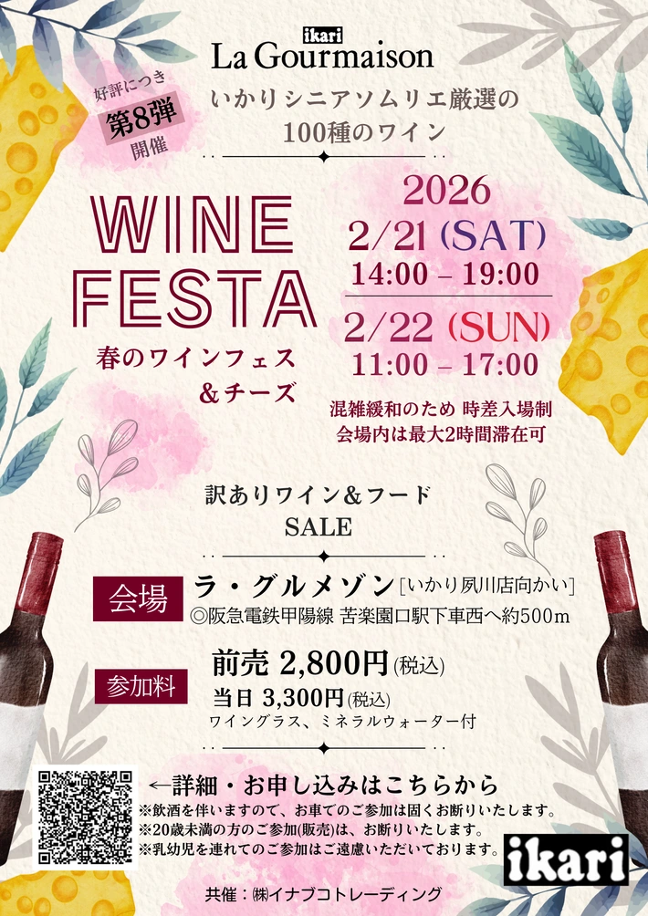 ikari いかり ワインの館 ラ・グルメゾン主催のワインイベントです。 【主催者からのコメント】 *いかり ワインの館 ラ・グルメゾン 春のワインフェス&チーズ* 2026年もいかり厳選のワインで乾杯 新着ワイン含む100種のワインを惜しみなく抜栓 春に合わせて仕入れた珍しいチーズとワインのマリアージュ体験をお楽しみいただけます 訳ありワイン&フードのお得・・・