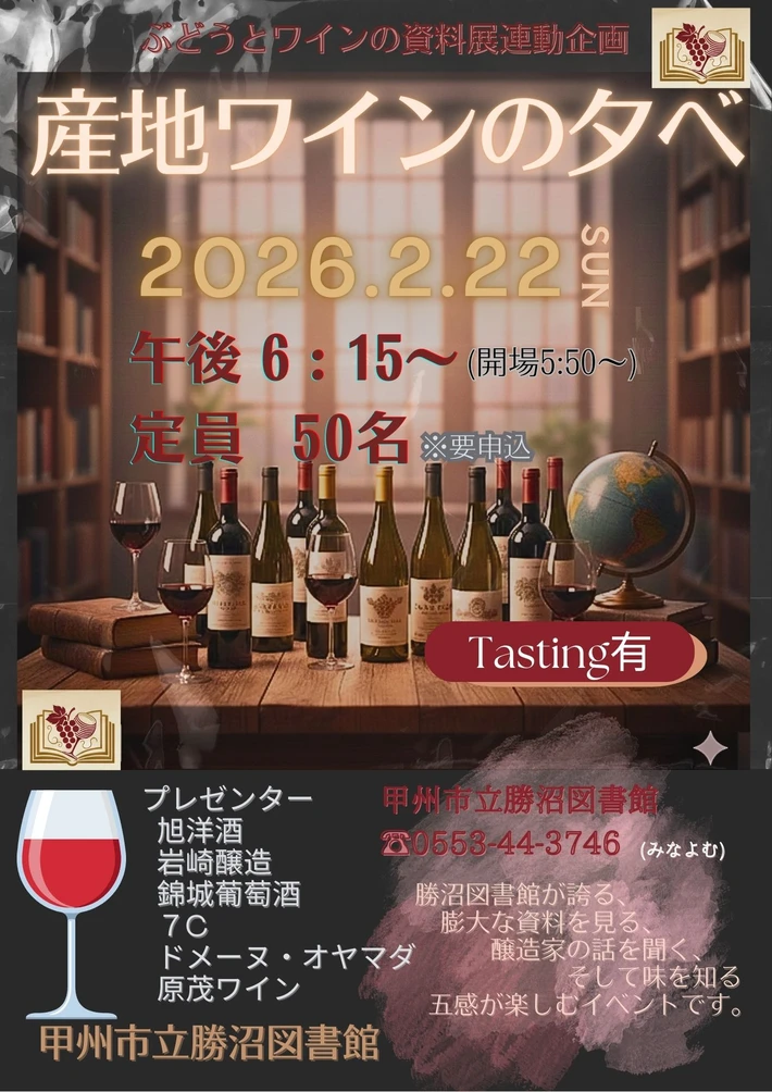 【主催者からのコメント】 今年度も開催!大人気イベント『産地ワインの夕べ』! 勝沼図書館の膨大なぶどう・ワイン資料を読む、醸造家の話を聞く、ワインの味を知る。 楽しみながら地元の味や文化、歴史を知るイベントです。 ワインが大好きな方、 地元の味って何?と思っている方、 ワインは初めての方、 もっと知りたい!という方、 どうぞ参加してください。 多くのワインフ・・・