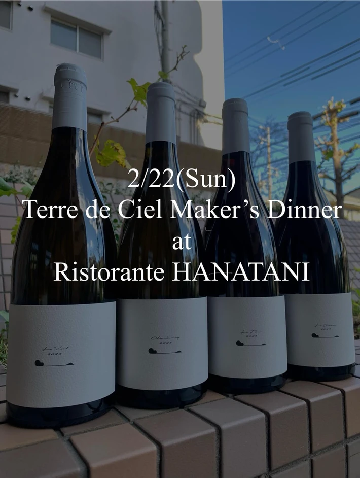【主催者からのコメント】 過去2回行ったリストランテ・ハナタニ、ikor、R the wine shop の3店の合同イベントに、今回は特別ゲストに長野県小諸のワイナリー”テール・ド・シエル”より栽培・醸造責任者の桒原一斗氏をお迎えし、ディナーイベントを開催いたします。 今回は前回までと違い、着席でのコースメニューとワインペアリングに・・・