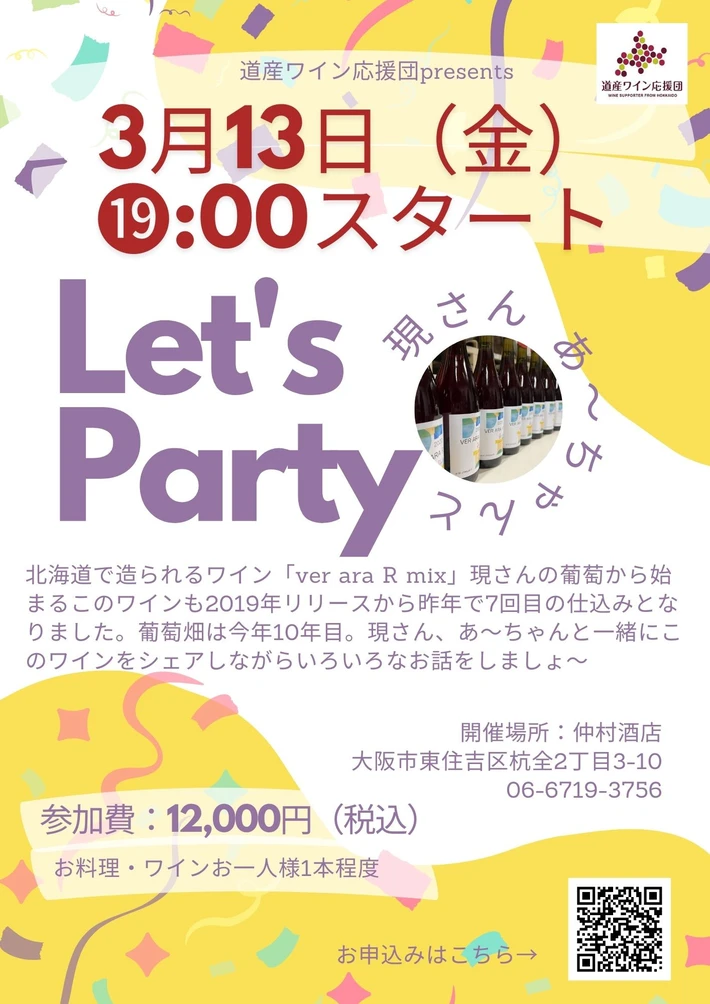 【主催者からのコメント】 北海道で造られるワイン「ver ara R mix」 現さんの葡萄から始まるこのワインも2019年リリースから昨年で7回目の仕込みとなりました。 葡萄畑は今年10年目。 現さん、あ~ちゃんと一緒にこのワインをシェアしながらいろいろなお話をしましょ~ 当日は「仲村わいん工房」のあのワイン達も大集合! 現さんの飲みたい道産ワインもリスト・・・