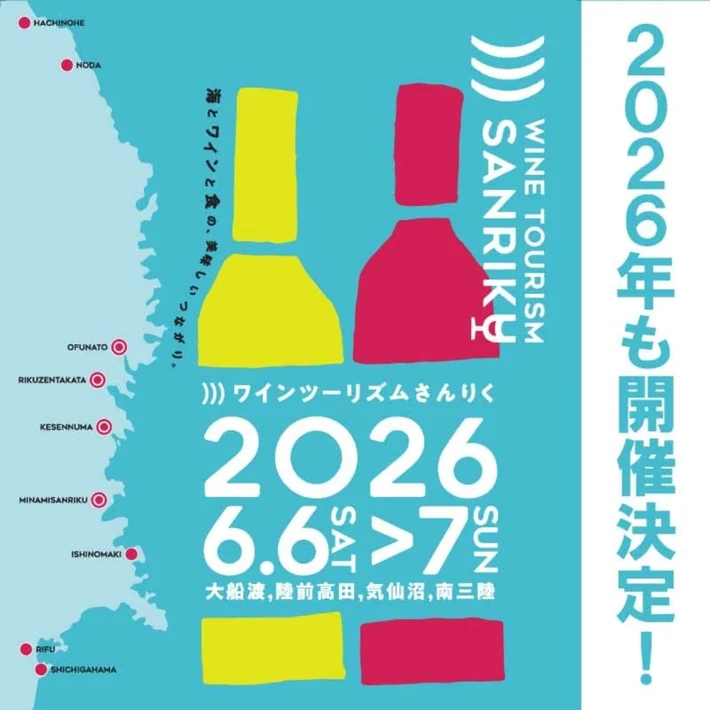 ワインツーリズムさんりく実行委員会主催のワインイベントです。 以下は主催者からのコメントになりますので、ぜひご覧ください。 ---------- ワインツーリズム®は、みなさまに、お好きなように、お酒や食事を楽しんでいただくツーリズムです。 会場となるワイナリーやお店の間を走る、専用のバスもご用意します。事前にガイドブックも届きますので、バスの運行表を眺めな・・・