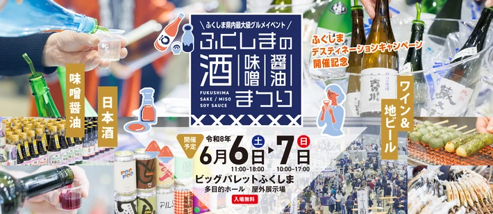 【主催者からのコメント】 醸造王国ふくしまの酒・味噌・醤油をはじめとする食の魅力を発信する県内最大級のグルメイベント開催! 福島県では6月6日(土)、7日(日)の2日間、郡山市ビッグパレットふくしまで「ふくしまの酒・味噌醤油まつり」を開催します。 県内50を超える酒蔵の日本酒やワイン、地ビールなどのふくしまの酒、全国の品評会で高く評価される味噌・醤油、県内各・・・