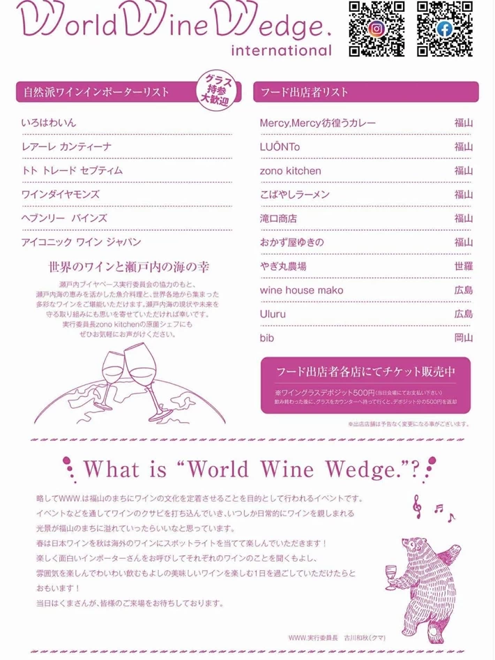 略して「www.」は、福山のまちにワインの文化を!イベントなどを通して、ワインのクサビを打ち込み、日常にワインを楽しむ風景が溢れていったらいいなと思っています!