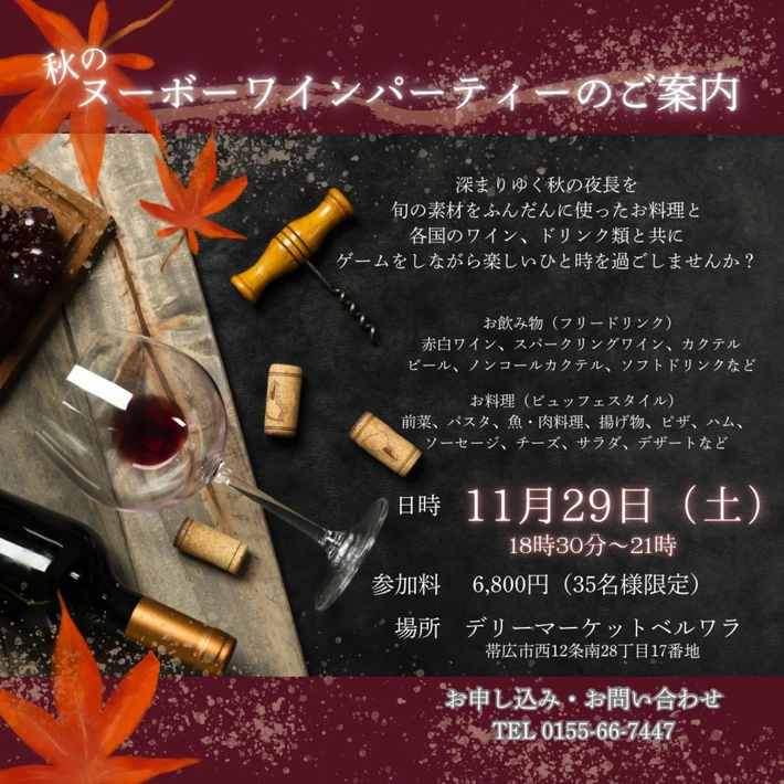【主催者からのコメント】 11月29日(土)に秋のヌーボーワインパーティーを開催します🍷 詳細は上の画像にてご確認ください。 人数に限りがございますので、早めのご予約のお電話お待ちしております😊 ■ 詳細・申込み ベルワラ 秋のヌーボーワインパーティー(インスタグラム)