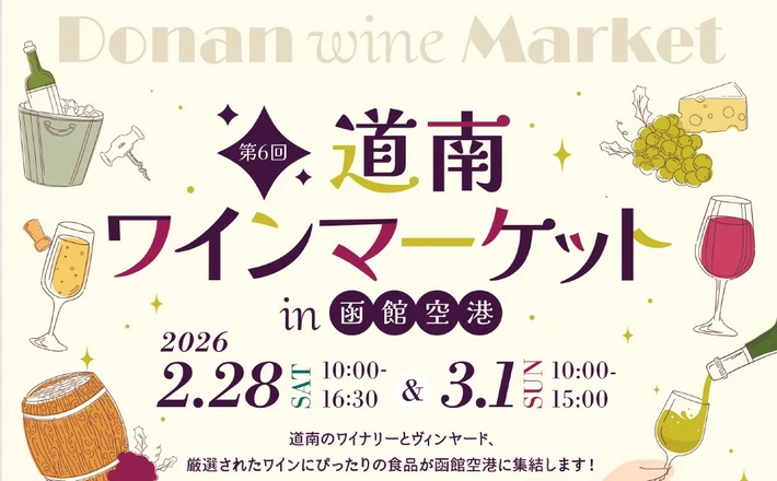 【主催者からのコメント】 2026年2月28日(土)・3月1日(日)の2日間、 「道南ワインマーケット」を函館空港1階・3階特設会場にて開催します。 「マルシェ」「角打ち」「ペアリング&ワイナリーステージ」など、多彩なコンテンツを通して道南ワインの魅力や人気フードを存分に味わうことができます。 飛行機をご利用の方はもちろん、地域の皆さまにもお楽しみ・・・
