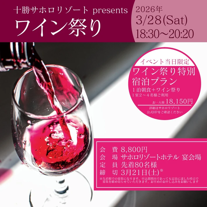 【主催者からのコメント】 サホロの春恒例イベント「ワイン祭り」が今年は3/28に開催決定いたしました! 普段お世話になっている業者さんが、それぞれ自慢のワインをお持ち寄りいただき、各種その場で飲み比べ、お気に入りのワインが見つかればその場でご購入も可能。 もちろん、ワインをおいしくいただくために料理長が腕によりをかけた豪華なお食事もご用意しております。 美味・・・