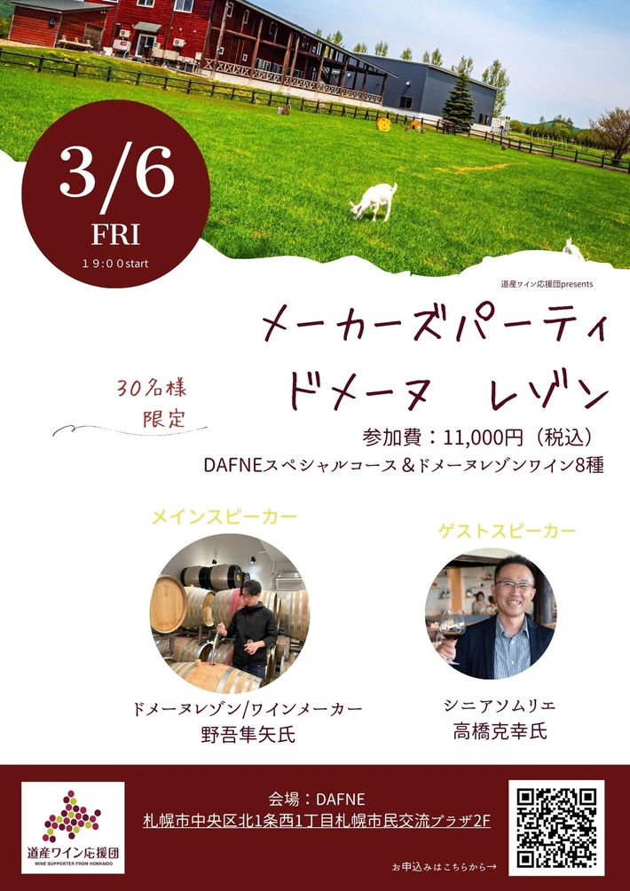 【主催者からのコメント】 富良野にある「ドメーヌレゾン」 やぎの絵のラベルが印象的なので見た事あるぞーという方も多いかと。 今回のメーカーズパーティは醸造家「野吾隼矢(やご しゅんや)」さんをメインスピーカーとしてお迎えします。 そしてゲストスピーカーとしてシニアソムリエの高橋 克幸(たかはし かつゆき)さんもお迎えして富良野のお話、ドメーヌレゾンのお話を交・・・