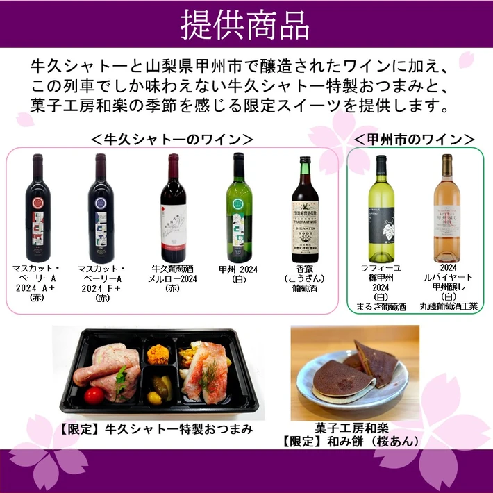 牛久シャトーのワインのほか、「日本ワイン140年史~国産ブドウで醸造する和文化の結晶~」として牛久市とともに日本遺産に認定されている甲州市のワイン、牛久シャトー特製おつまみ、菓子工房和楽の限定スイーツもお楽しみいただけます。