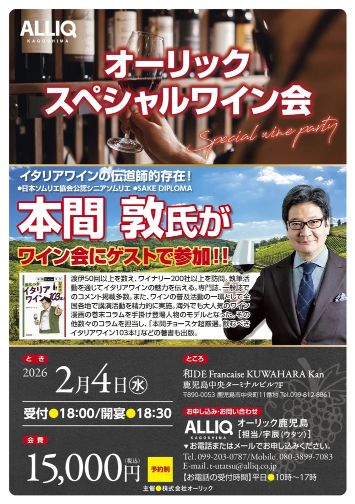 【主催者からのコメント】 イタリアワイン界のレジェンド、シニアソムリエの本間敦氏をゲストにお招きし、一夜限りの「スペシャルワイン会」を開催いたします。 本間氏は渡伊50回以上、200社以上のワイナリーを訪問された経験を持ち、人気ワイン漫画のモデルにもなったイタリアワインの第一人者です。 当日は本間氏の深い知見と情熱溢れるトークと共に、厳選されたワインを心ゆく・・・