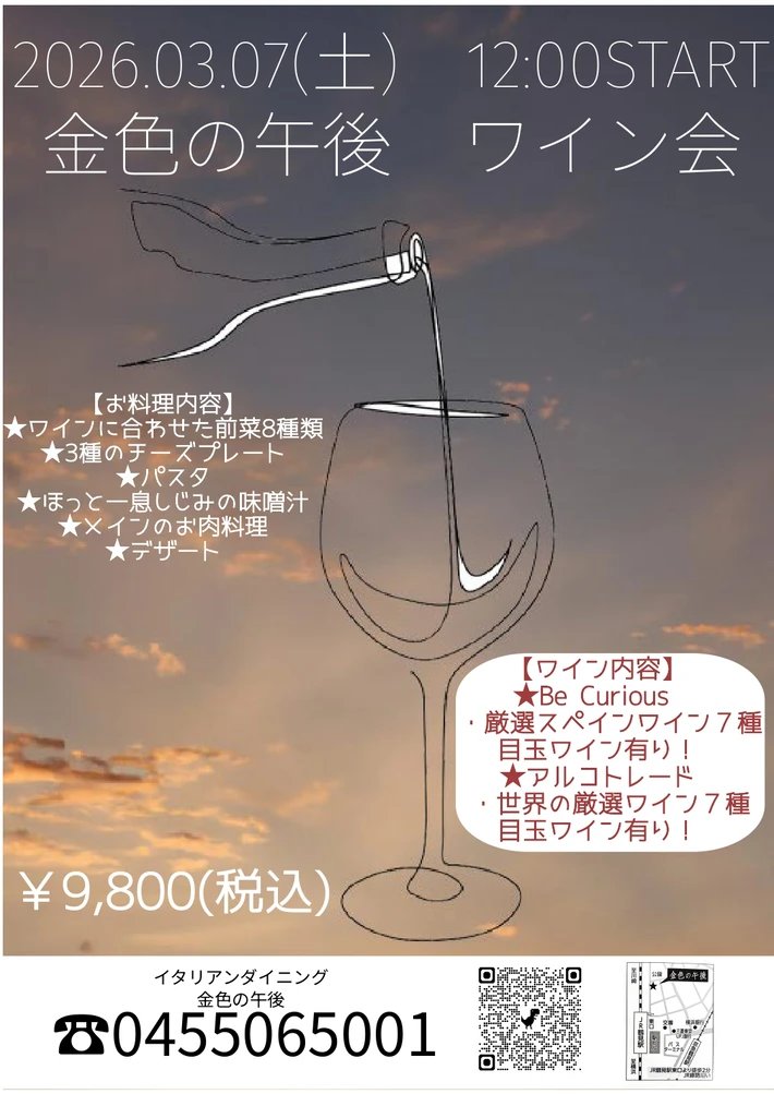 【主催者からのコメント】 イタリアンダイニング 金色の午後主催のワインイベントです。 ワイナリー・インポーターの方をお招きした本格的な試飲会をイメージしたワイン会です! もちろんおかわり自由!!ワインに合わせたお食事もしっかりでます! 今回お招きするのは、感動するスペインワインと出会える【Be Curious (ビー キュリアス)】の野嶋さん。 世界各国多彩・・・