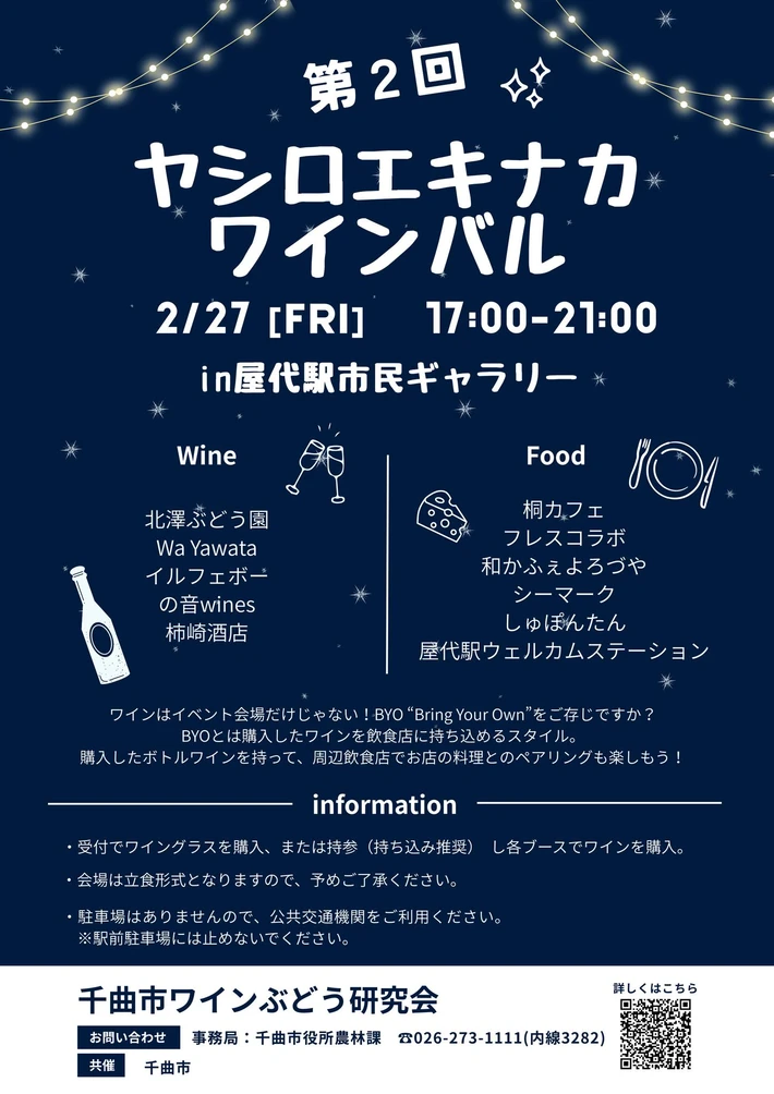 【主催者からのコメント】 第1回目は夏に開催しましたが、好評だったので冬の開催となりました。 真冬ですが、市民ギャラリーは屋内で暖房きいてます。 今時「花金」は言わないと思いますが、休み前の金曜日の夜にお出かけしましょう! 仕事帰りの同僚と、家族みんなで、お出で下さい。 今回はフードも増えました。ボトルで購入して近くのお店でBYOも出来ます。 千曲市の楽しい・・・