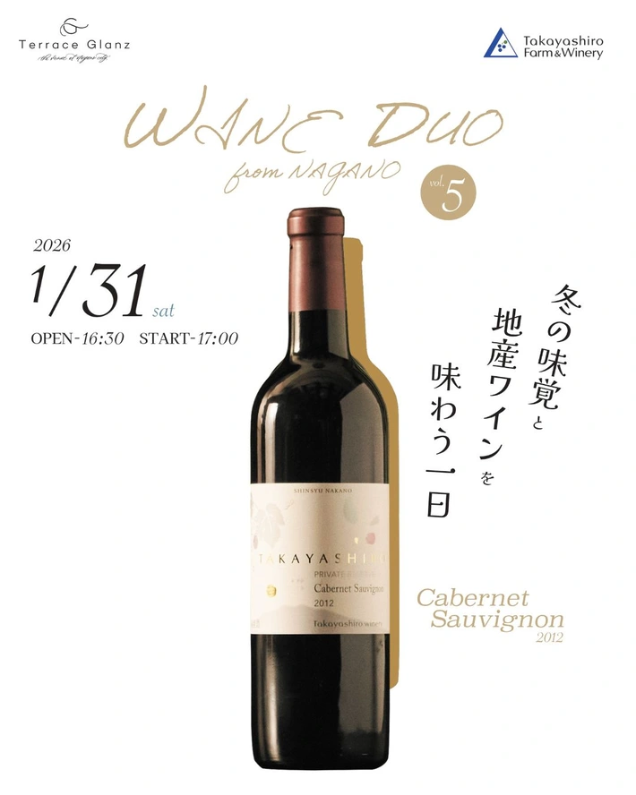 【主催者からのコメント】 テラスグランツのワイン会『WINE DUO from Nagano』。 食文化を通じた地域貢献を目的としてワイナリーと手を組み、ワイン産地としての長野を盛り上げるイベント。いよいよ第5回目の開催です。 第5回目のパートナーは中野市の『たかやしろファーム&ワイナリー』。 こちらは中野市高社山の南麓に位置する自社畑を持つ農家経営のワイナ・・・