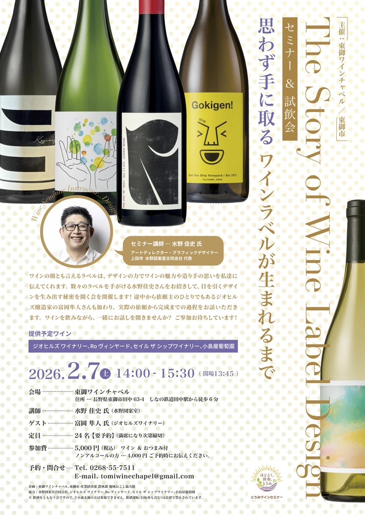 【主催者からのコメント】 数々のかわいい、すてきな、ワインラベルを手がける上田市在住のグラフィックデザイナー水野佳史さん(水野図案室)を招いてのワインセミナーが、東御ワインチャペルさんにて開催されます。 水野さんは錫の器で知られる「能作」のグラフィックデザインやサインを手がけるなど、第一線で活躍されるアートディレクター・グラフィックデザイナー。 目を引くデザ・・・