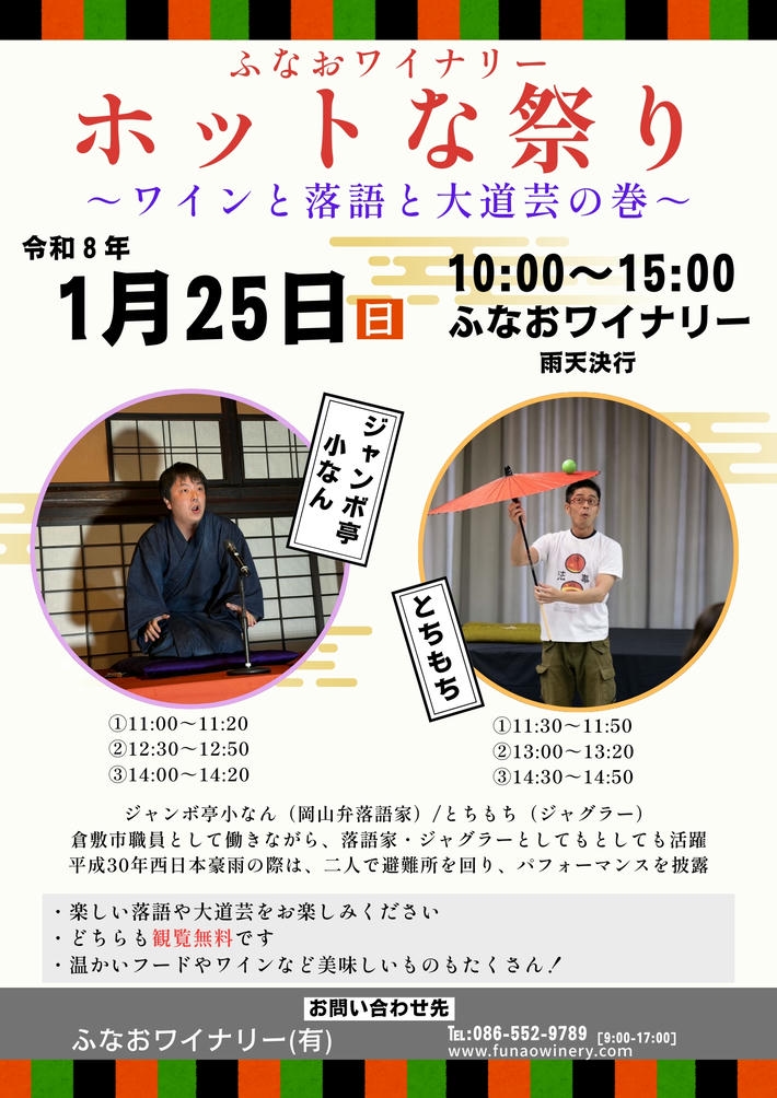【主催者からのコメント】 昨年に引き続き今年も、冬の寒さを吹き飛ばすイベント「ホットな祭り」を開催します。 通常メニューに加え、うどん、焼き芋、ぜんざいや、ホットワイン、ブドウシロップのお湯割りなど、この日限りの温かいフードやドリンクもご用意いたします。 また、今回は岡山弁落語家のジャンボ亭小なんさんと、ジャグラーのとちもちさんが登場! 熱いパフォーマンスで・・・