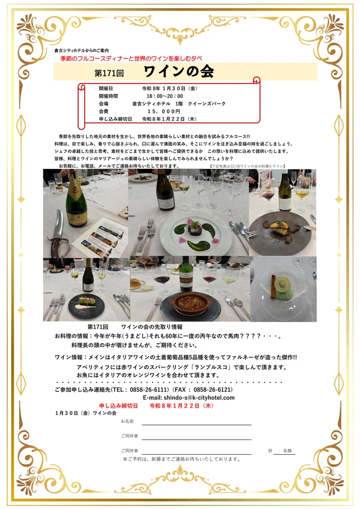 【主催者からのコメント】 倉吉シティホテルではワインの会を楽しむ会を開催いたします。 季節を先取りした地元の素材を生かし、世界各地の素晴らしい素材との融合を試みるフルコース!! 料理は、目で楽しみ、香りで心揺さぶられ、口に運んで満面の笑み。そこにワインを注ぎ込み至福の時を過ごしましょう。 シェフの卓越した技と思考。素材をどこまで生かして皆様へご提供できるか ・・・