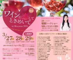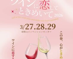 【主催者からのコメント】 今回で第6回目を迎える、西日本最大級のワインフェス! 全国のワイナリーや、フードの出店も多数🍽️✨ 県内外のワイナリーが集まるので、普段なかなか味わえないワインの飲み比べや、ワインに合うフードとのペアリングを 気軽に楽しめます🥂 ワインが好きな方も、これから楽しみたい方も。 春のお出かけ先のひとつに、ぜひ遊びに来てください🌸 ■ 詳 … 続きを読む ワインに恋してときめいて in Okayama 2026
