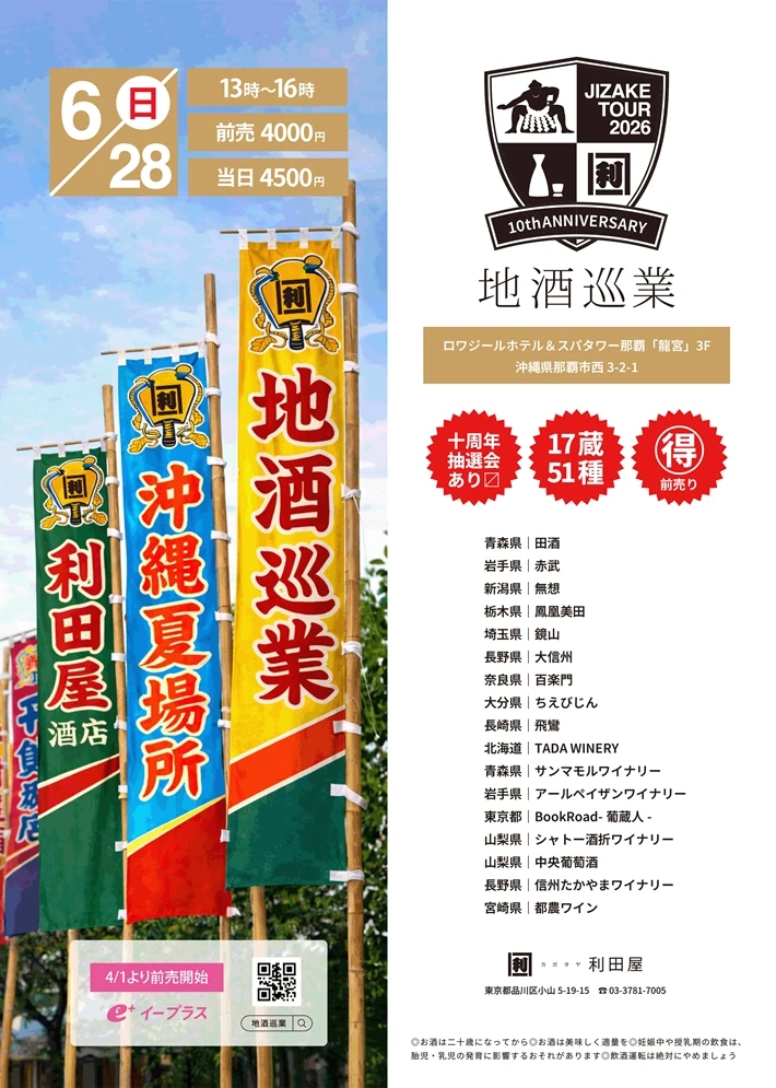 【主催者からのコメント】 (有)利田屋酒店主催のワインイベントです。 東京の地で地酒に特化した商いをさせていただき約40年。 慣れ親しんだ東京を飛び出し、全国同志蔵元と沖縄で地酒を楽しむ会を開催します。 今年で、沖縄開催させて頂き、10年目を迎えました! 今回は、日本酒9蔵と日本ワイン蔵8蔵計17蔵が、沖縄巡業!! フンドシをしっかり締め、体調万全でご来場く・・・
