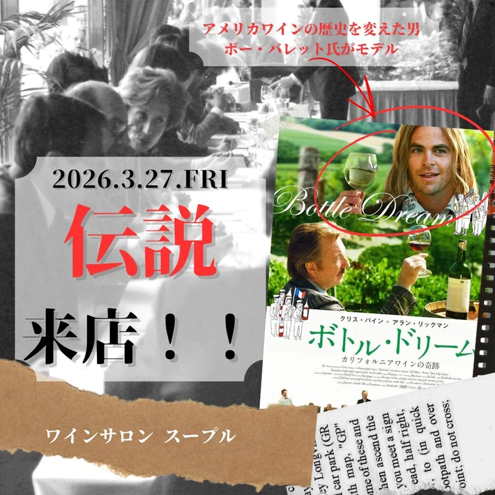 【主催者からのコメント】 あれから50年。ワインの歴史を変えた男を私たちは迎えます。 今回のイベントについて、どうしても、もう一度きちんと書いておきたいことがあります。 それは—— Bo Barrett(ボー・バレット)という人物が、どれほど特別な存在なのかということです。 ■ 詳細・申込み ワインサロン・スープル シャトー・モンテレーナ ワイン会
