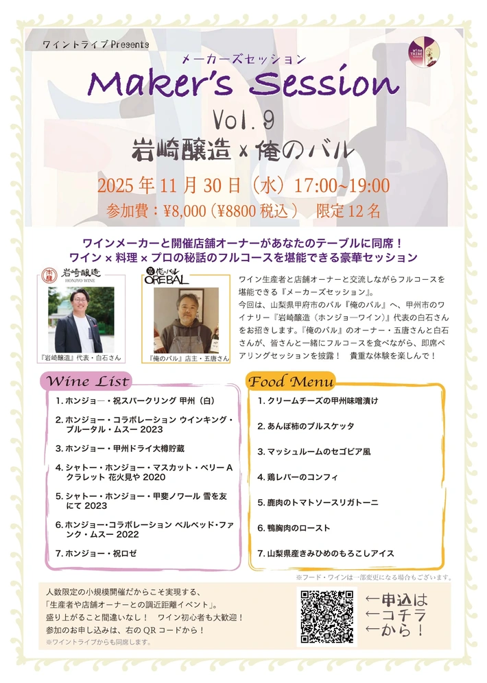 【主催者からのコメント】 山梨県甲州市のワイナリー『岩崎醸造』の醸造家・白石さんと、山梨県甲府市のダイニングバー『俺のバル』のオーナー・五唐さんによるトライアルセッション。 ■ 詳細・申込み ワイントライブ メーカーズセッションVol.9 岩崎醸造 x 俺のバル