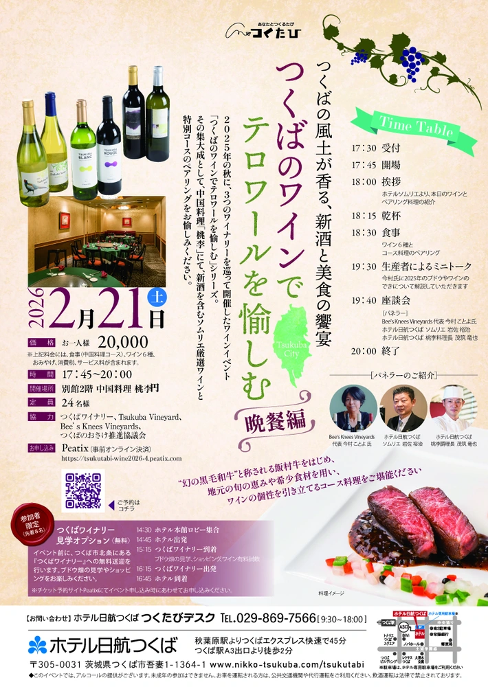 ホテル日航つくば つくたび主催のワインイベントです。 【主催者からのコメント】 つくばの風土が香る、新酒と美食の饗宴 2025年はこれまでに、ワイナリー訪問を中心とした第1弾から第3弾までを実施し、つくば近郊の個性豊かなワイナリーの魅力を紹介してきました。 その集大成として、中国料理とのペアリングを楽しむ『つくばのワインでテロワールを愉しむ2025 晩餐編』・・・