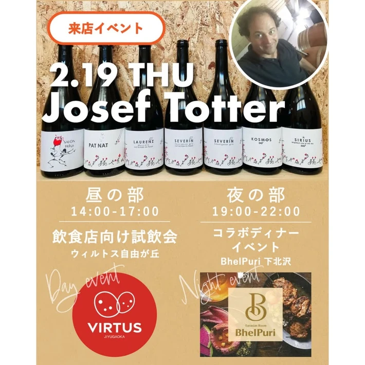 ※当イベントは飲食店向けのイベントになります。 【主催者からのコメント】 ウィルトス自由が丘主催のワインイベントです。 昼の部は、前回の試飲会でも大人気だったジョセフの来日に合わせ、keppagle小山さんのお声がけにより開催する飲食店様向け試飲会です。 夜の部は、ジョセフ・トッターのワインに合わせて、BhelPuri小師さんがお料理をご提供いただく、一夜限・・・