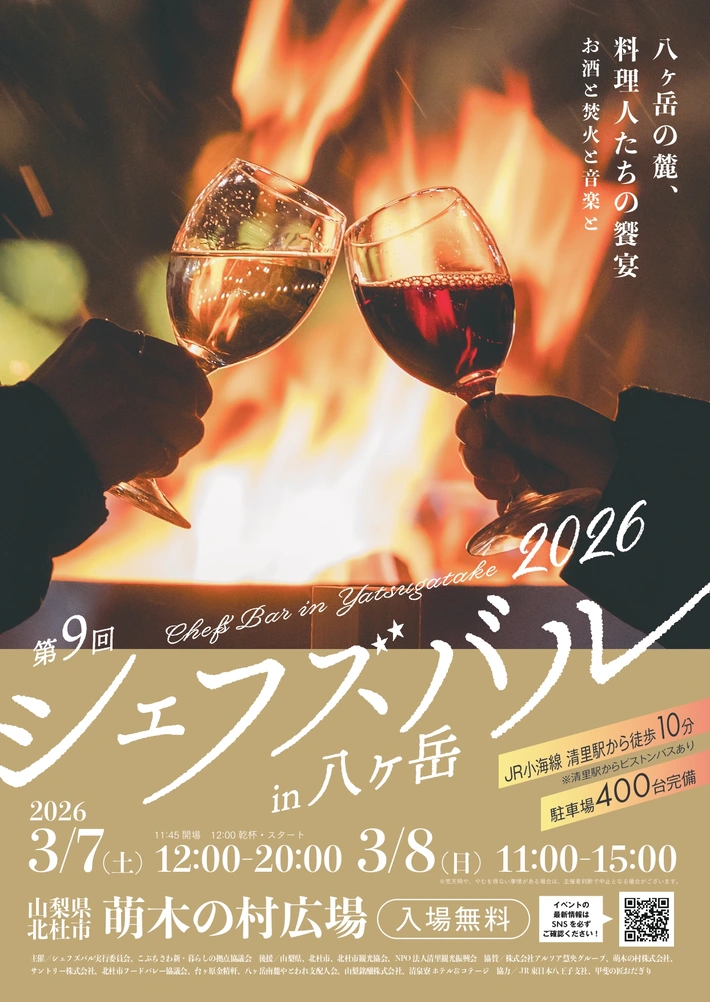【主催者からのコメント】 八ヶ岳の食材と料理人による饗宴――――― 八ヶ岳の冬は、豊かな自然の恵みと、ひときわ澄んだ空気が味わえる、とっておきの季節。 この地で人気のレストランを営むシェフたちが一堂に会し、旬の食材を使った料理をふるまいます。 シェフたちの真摯な思いが詰まった料理を五感で感じながら、八ヶ岳の名水が醸すお酒、友人との語らい、新たな出会いに胸を躍・・・