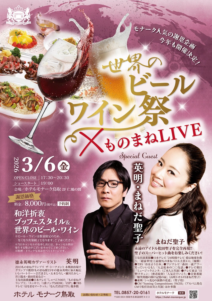 【主催者からのコメント】 世界のビールとワイン×ものまねLIVE開催 ホテルモナーク鳥取では、恒例企画「世界のビールとワイン祭」を開催いたします。 世界各国のビールやワイン、和洋折衷ブッフェ料理とともに、特別企画として、ものまねタレント「英明」「まねだ聖子」によるライブステージを同時開催。 名曲の数々を完全再現し、会場を華やかに盛り上げます。 ■ 詳細・申込・・・