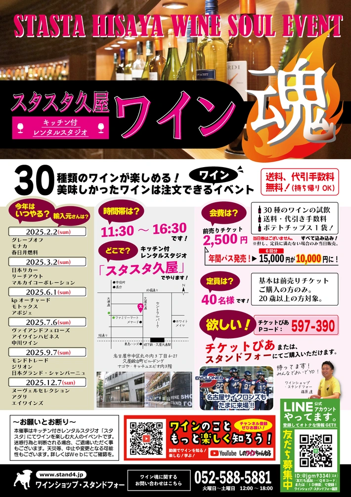 【主催者からのコメント】 30種類のワインが試飲できる美味しいワインイベント! 美味しかったワインはその場でご注文、翌週末にはご自宅へお届けすることができます。 ■ 詳細・申込み ワインショップスタンドフォー スタスタ久屋ワイン魂