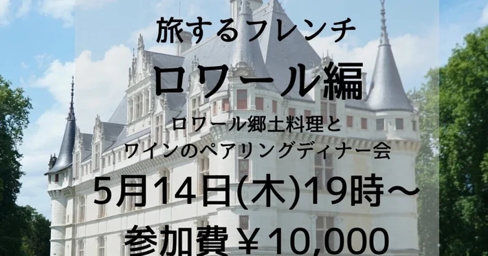 【主催者からのコメント】 行ってみたい!知りたい! そんな街をお料理とワインでフレンチ旅🇫🇷♪ 今回はホワイトアスパラに注目✨ ロワール編です♪ 今回は古城の地ロワール編 ホワイトアスパラも終盤に差し掛かる時期ですが 今年最後のホワイトアスパラを ロワールワインと一緒にみんなで楽しめたらと思っています。 歴史や文化!名スポット! 縁のある方から頂く現地情報✨・・・