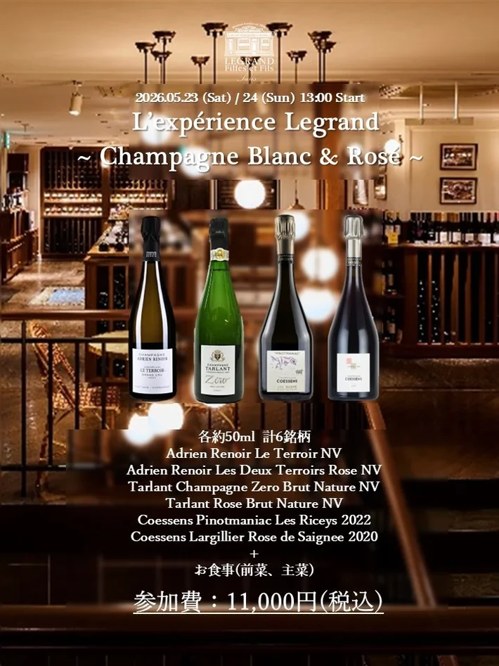 【主催者からのコメント】 この度ルグラン東京では、シャンパーニュ白&ロゼ計6種類飲み比べをお楽しみいただく「レクスペリアンス・ルグラン」を開催。 モンターニュ・ド・ランス、ヴァレ・ド・ラ・マルヌ、コート・デ・バールで造られる白&ロゼワインをワインに合わせたお料理と共にお楽しみいただきます。 また、当日限定で提供ワインを10%OFFにてご購入いただけます。 ■・・・