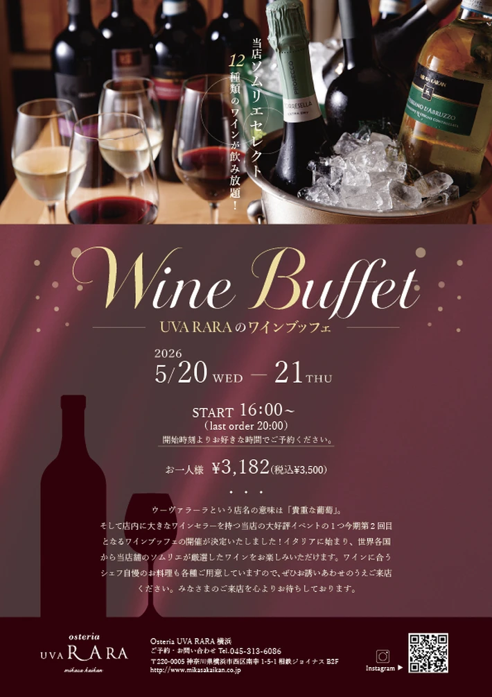 【主催者からのコメント】 相鉄ジョイナス 地下2階 オステリア ウーヴァ・ラーラよりワインブッフェ開催のご案内です。 当店ソムリエがセレクトした、12種類のワインが2時間飲み放題のイベントです。4月から毎月開催になりました。ワインはイタリアをはじめ世界各国からセレクト。 シェフ自慢のお料理とともにお楽しみください。 ■ 日 時 2026年5月20日(水)~2・・・