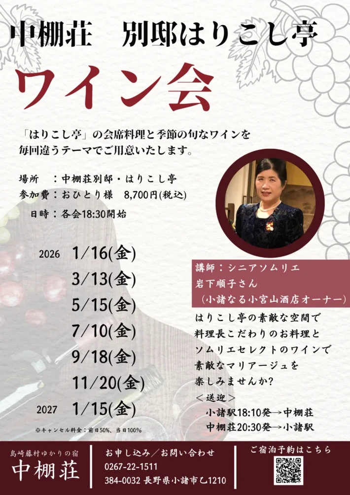 【主催者からのコメント】 浅間山の麓、千曲川の流れを近くに感じるここ小諸も、季節ごとに美しい表情を見せてくれます。 中棚荘別邸はりこし亭にて、この素晴らしい風土が育む食と、歴史ある建物を活かした文化的な集いとして、例年ご好評をいただいております「ワイン会」を、来たる2026年より全7回にわたり開催する運びとなりました。 ■ 詳細・申込み 中棚荘 登録有形文化・・・