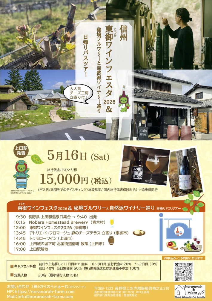 【主催者からのコメント】 今年も開催される「東御ワインフェスタ2026」。 個性あふれる生産者がつくる良質なワインの飲み比べや、地元食材を使ったフードが楽しめる催しです。それに合わせて、近隣をめぐるツアーが開催されます。 クラフトビール、自然派ワイン、チーズといった発酵食品のつくり手をめぐるほか、上田城の城下町・北国街道柳町の散策もついた、東信州をめぐる上田・・・