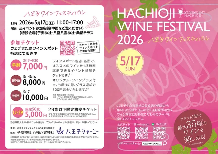 【主催者からのコメント】 本イベントは2013年にスタートし、今年で14年目を数える八王子を代表するワインイベントです。 毎年春に、八王子駅周辺の個性豊かな飲食店が参加し、国内外の厳選ワインと参加店の自慢料理を楽しめるスタイルが長年にわたり親しまれてきました。近年では1,200人以上の方が参加されます。 今年は「この街を知って繋がる。ワインが導く、街歩き。」・・・
