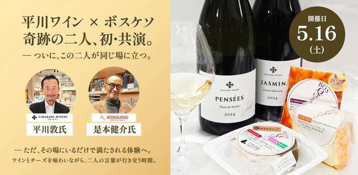 【主催者からのコメント】 日本の味づくりを牽引する二人、 ワイン界のトップ醸造家平川敦氏と日本チーズ界のトップチーズ職人是本健介氏。 その二人が同じ空間で、 互いの言葉と技が響き合う—— まさに“奇跡のセッション”が目の前で立ち上がる瞬間です。 二つの美が重なり合うその場に身をおくと、 あなたの五感は、静かに、そっと動き出します。 二人の“本気”が紡ぐ味わい・・・