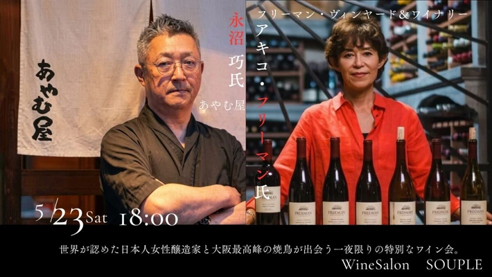 【主催者からのコメント】 「大阪で特別なワイン会を探している」 「ワインイベントは好きだけど、本当に記憶に残る1日を体験したい」 そんな方に、2026年5月23日(土)ワインサロン スープルで開催する、この春最大級の特別イベントをご案内します。 今回お迎えするのは、カリフォルニア・ソノマで活躍する日本人女性醸造家「アキコ・フリーマン」氏。 さらに、大阪・福島・・・