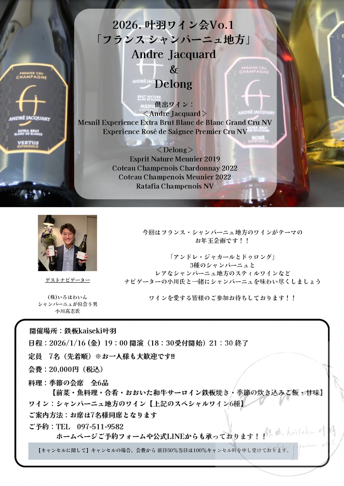 【主催者からのコメント】 2026年のワイン会 1月は16日(金)「シャンパーニュ地方のワイン」 25日(日)「南アフリカを先導する2大生産者」 の2日間開催です。 詳細は以下をご確認ください!! ■ 詳細・申込み 鉄板kaiseki叶羽 叶⽻ワイン会「シャンパーニュ地方のワイン」 鉄板kaiseki叶羽 叶⽻ワイン会「南アフリカを先導する2大生産者」