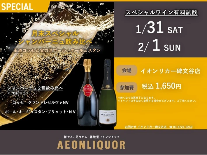 【主催者からのコメント】 碑文谷店のワインBARでは月末の土日にスペシャルなワインをグラスでお飲みいただけます 今月は1月31日・2月1日 人気の高いシャンパーニュ2種飲み比べです 週末のひとときを贅沢な気分でお過ごしください ■ 詳細・申込み イオンリカー碑文谷店 スペシャル有料試飲 シャンパーニュ2種