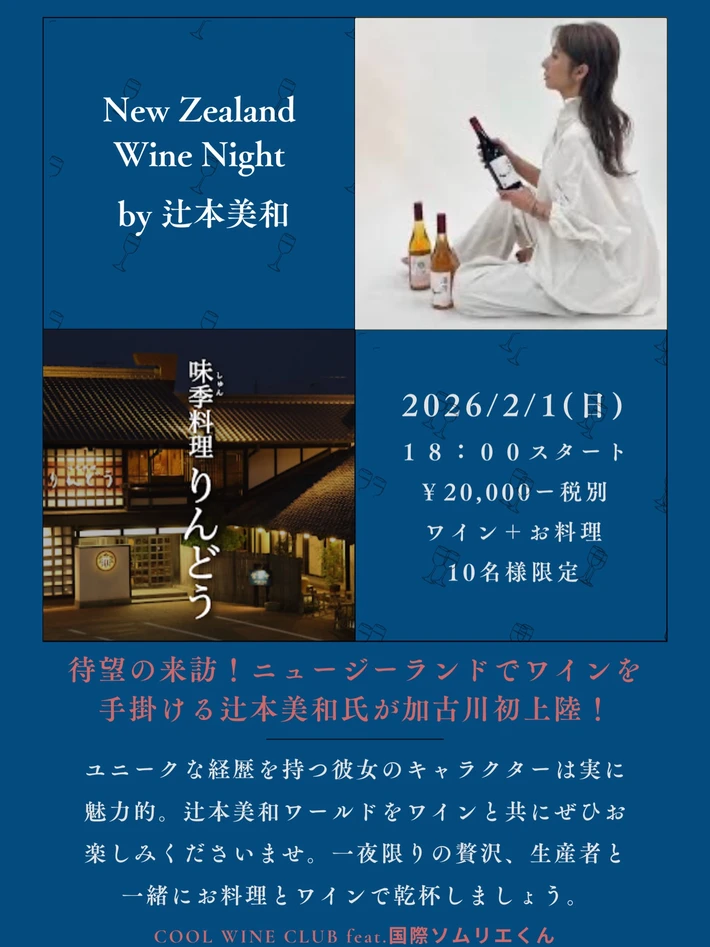 【主催者からのコメント】 2026年、第一回目の『COOL WINE CLUB』のご案内です🍷 今回はいきなり目玉イベント‼️ ニュージーランドでワインを造る辻本美和さんをお招きしてのメーカーズディナーです🇳🇿 ワインはもちろん、美和さんのキャラクターも魅力的でお話がとっても面白いです❗️ 待望の加古川初来訪🍷 間違いなく楽しい会になることをお約束します😊 ・・・