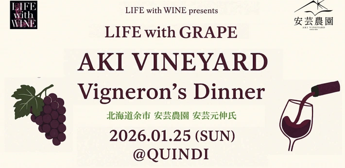 【主催者からのコメント】 LIFE with WINE presents LIFE with GRAPE #1 安芸農園 🍇Vigneron’s Dinner🍷 ⸻ 日本ワインの銘醸地・北海道余市で120年の歴史を誇る老舗ぶどう農家、 安芸農園の6代目代表・安芸元伸氏をお招きし、 Maker’s Dinner ならぬ “Vignero・・・