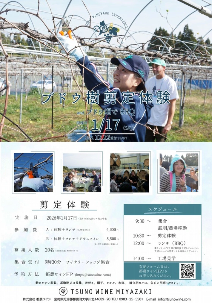 【主催者からのコメント】 7年ぶりの開催!ブドウ樹剪定体験&ブドウ畑でBBQ 2026年1月17日(土)に「ブドウ樹剪定体験&ブドウ畑でBBQ」を開催します。 収穫を終えたブドウの樹は、次のシーズンに向けて剪定作業を行います。 本イベントでは、一枝一枝、ハサミを使って伸びた枝を切る「剪定作業」を体験していただきます。 作業体験のあとは、お楽しみのランチタイム・・・