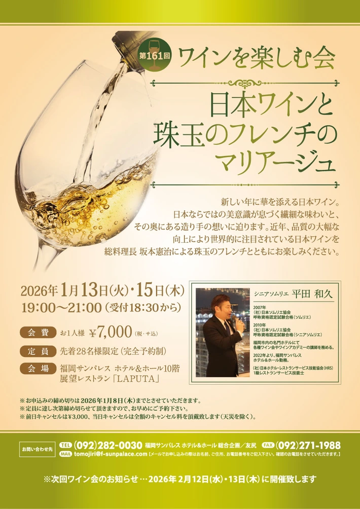 【主催者からのコメント】 新しい年に華を添える日本ワイン。日本ならではの美意識が息づく繊細な味わいと、その奥にある造り手の想いに迫ります。 近年、品質の大幅な向上により世界的に注目されている日本ワインを総料理長 坂本憲治による珠玉のフレンチとともにお楽しみ下さい。 ■ 詳細・申込み 福岡サンパレスホテル 日本ワインと珠玉のフレンチのマリアージュ