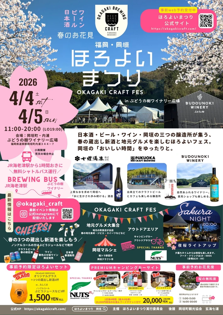 【主催者からのコメント】 桜咲くぶどうの樹ワイナリーで、ワイン・日本酒・クラフトビールを楽しむ春限定のほろよいイベントを開催します。 ワイン・日本酒・ビール3つの醸造所の春の新酒が大集合。 美味しい新酒と地元岡垣グルメ、そして夜には幻想的な夜桜ライトアップも。 昼も夜も楽しめる、春だけの特別な2日間。ご家族や友人と、桜の下でほろよい気分をお楽しみください。 ・・・